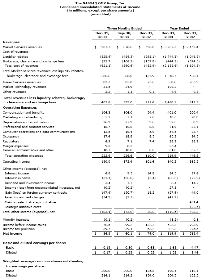 New York, N.Y.-The NASDAQ OMX Group, Inc. ("NASDAQ OMX®"; NASDAQ: NDAQ) today reported net income of $36.8 million, or $0.17 per diluted share, for the fourth quarter of 2008 and $319.9 million, or $1.58 per diluted share for the full year of 2008.