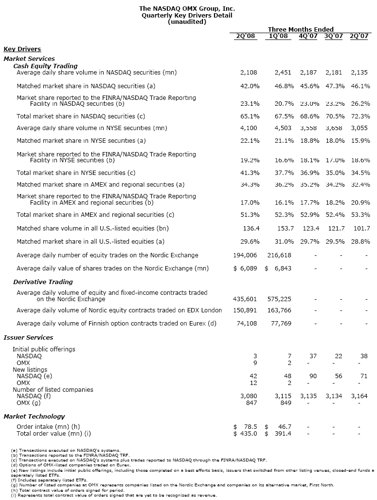 - The increase from the prior year quarter is primarily due to higher trading volumes for U.S.-listed equities. Volume matched on NASDAQ systems increased to 136.4 billion shares in the second quarter of 2008, up 34.1% from 101.7 billion shares in the second quarter of 2007.