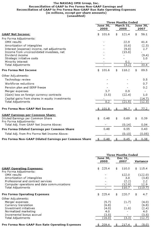 "When looking at our results on a pro-forma non-GAAP basis, we delivered strong net income growth both sequentially and year-over-year," said David Warren, NASDAQ OMX's Chief Financial Officer. "Our integration with OMX is moving forward better than expected and the integration of PHLX is well underway despite closing the transaction only two weeks ago. These integrations, coupled with the planned acquisitions of the Boston Stock Exchange and certain assets of Nord Pool, provide us with a platform to drive continued efficiencies and improved performance this year and well into 2009 and beyond."